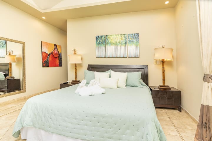 Tiszta kék ég, néhány törékeny felhő egy nyugodt kék óceán felett, az előtérben egy homokos strand.