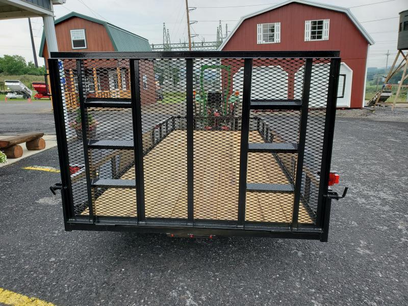 A black metal utility trailer with a wooden floor is parked in a driveway. The trailer has a metal gate with a mesh design and is attached to a black hitch. The driveway is surrounded by a red barn with white trim and a green roof, and there are power lines above. There are also some potted plants and a red car visible in the background.