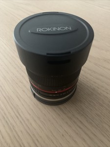A „ROKINON” márkanévvel ellátott fekete lencsesapka fafelületre kerül. A kupak sima, matt felülettel rendelkezik, kör alakú, enyhén ívelt, hogy szorosan illeszkedjen az objektívhez. A márkanév a kupak tetején van középen, és úgy tűnik, hogy a kupak kifogástalan állapotban van, látható karcok vagy nyomok nélkül.