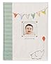 A white book with a picture of a baby in a frame on the cover. The book has a green spine and a white cover with a small white pig illustration at the bottom. There are colorful bunting strings above the frame, and a red heart-shaped balloon with a string on the right side of the cover.