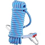 A close-up image of a blue climbing rope with a textured surface and a metal carabiner attached to it. The rope is coiled and has a blue and white pattern. The carabiner is silver with a red safety clip.
