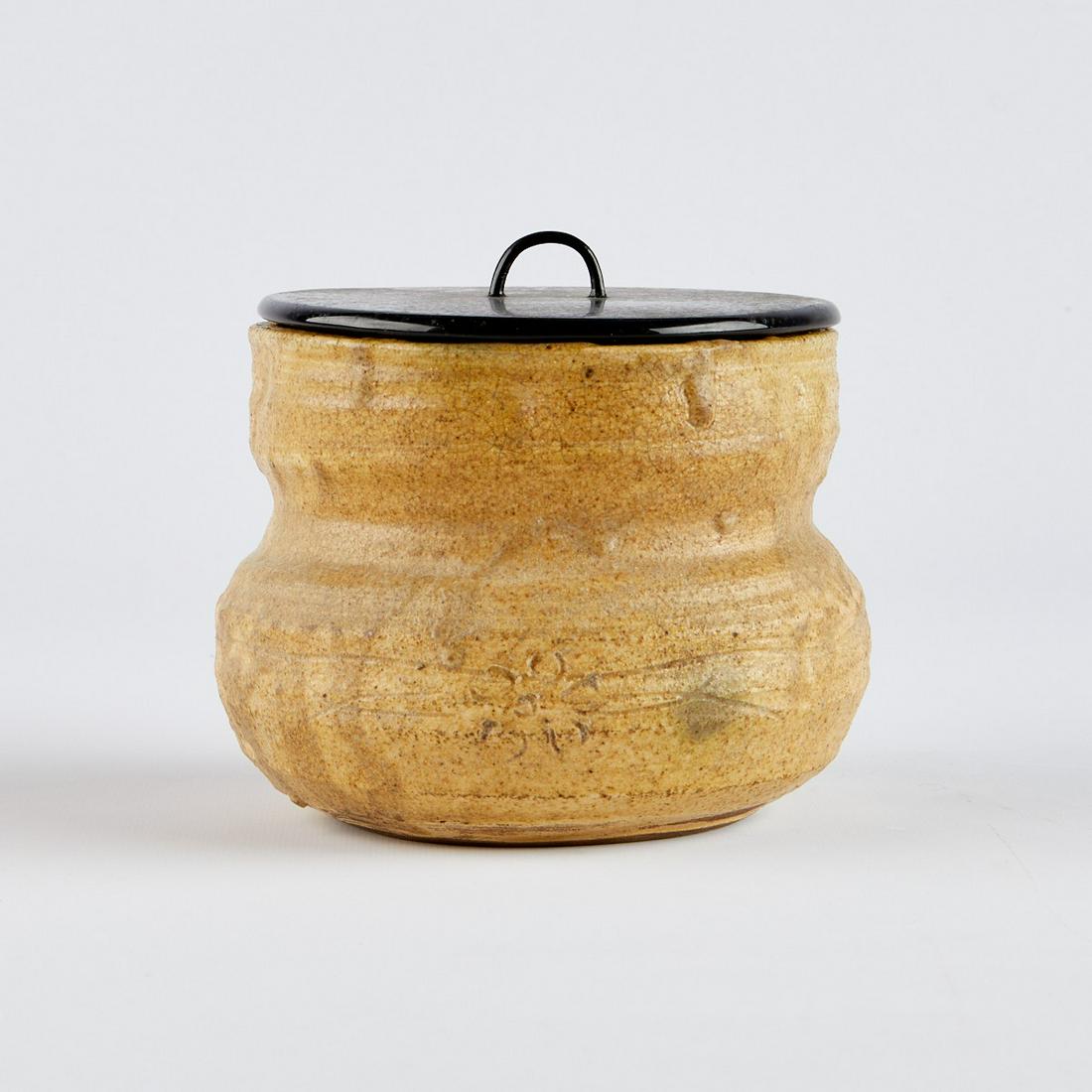 Fehér alapon egy rusztikus agyagedény texturált felülettel és fekete fogantyúval.