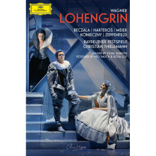 0 | A promotional poster for the opera 'Lohengrin' featuring three main characters. On the left, a woman in a black dress with a feathered headpiece is standing on a staircase. In the center, a man in a blue and silver costume is standing on the stairs, looking to the side. On the right, a woman in a white dress with a blu... | A „Lohengrin” opera reklámplakátja három főszereplővel. A bal oldalon egy fekete ruhás, tollas fejfedős nő áll a lépcsőn. Középen egy kék-ezüst kosztümös férfi áll a lépcsőn, és oldalra néz. A jobb oldalon egy fehér ruhás, kék fejfedős nő áll a lépcsőn, és a férfi felé néz. A háttér egy lépcsőház stilizált ábrázolása k... | |