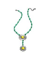 0 | A close-up image of a green beaded necklace with a central yellow flower-like pendant. The beads are predominantly green with some white and yellow accents. The pendant features a yellow center with white and yellow petals, resembling a daisy. The necklace is set against a white background. | Közeli kép egy zöld gyöngyös nyakláncról, középen sárga virágszerű medállal. A gyöngyök túlnyomórészt zöldek, néhány fehér és sárga árnyalattal. A medál sárga közepe fehér és sárga szirmokkal, százszorszépre emlékeztet. A nyaklánc fehér háttér előtt áll. | |