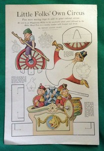0 | A vintage-style poster featuring a whimsical illustration of a carousel with a clown character riding a carousel horse. The poster includes text at the top that reads 'LITTLE FOLK'S OWN CIRCUS' and a smaller text block at the bottom with instructions on how to make a carousel. The illustration is surrounded by a green ... | Vintage stílusú poszter egy körhinta szeszélyes illusztrációjával egy körhinta lovon lovagló bohóc karakterrel. A poszter tetején a „KIS NÉP CIRKUSZA” felirat olvasható, alul pedig egy kisebb szövegblokk található, amely a körhinta készítésére vonatkozó utasításokat tartalmazza. Az illusztrációt zöld szegély veszi körü... | |