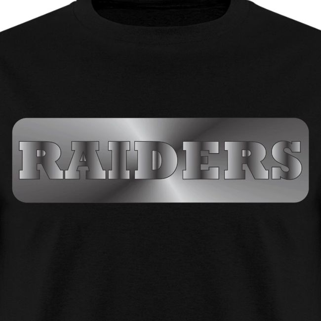 0 | A black t-shirt with a metallic silver Raiders logo on the front. The logo is centered and features the word 'RAIDERS' in a stylized font with a metallic finish. The t-shirt appears to be a standard crew neck style with a plain black background. | Fekete póló fémes ezüst Raiders logóval az elején. A logó középen van, és a „RAIDERS” szót stilizált betűtípussal, fémes bevonattal látja el. Úgy tűnik, hogy a póló szabványos legénynyakú stílus, sima fekete háttérrel. | |