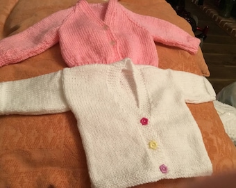 0 | A white knitted sweater with a pink collar and cuffs is laid out on a bed with a pink blanket. The sweater has a buttoned front with a pink button and a small pink flower on the left side. | Egy rózsaszín gallérral és mandzsettával ellátott fehér kötött pulóver egy rózsaszín takaróval ellátott ágyon van lefektetve. A pulóver eleje gombos, rózsaszín gombbal, bal oldalán egy kis rózsaszín virággal. | |