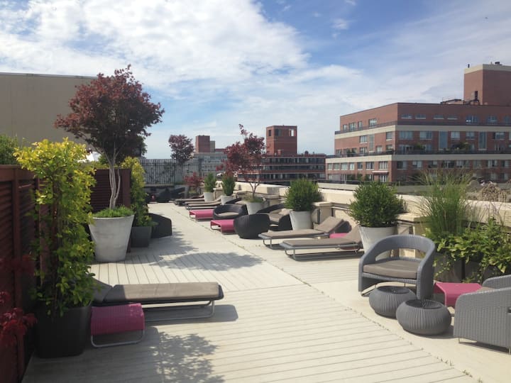 0 | A rooftop patio with a variety of modern outdoor furniture, including lounge chairs, benches, and tables. The patio is adorned with potted plants and shrubs, providing a lush and inviting atmosphere. The flooring is made of wooden planks, and the space is surrounded by a railing with a view of the city skyline. The sky... | Tetőtéri terasz számos modern kerti bútorral, köztük nyugágyakkal, padokkal és asztalokkal. A teraszt cserepes növények és cserjék díszítik, buja és hívogató légkört biztosítva. A burkolat fa deszkából készült, a teret korlát veszi körül, ahonnan a város látképére nyílik kilátás. Az ég részben felhős, és az általános h... | |