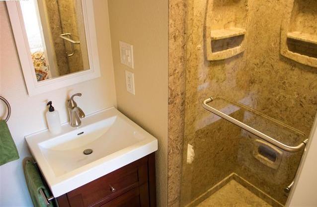 0 | A modern bathroom with a white sink and a beige shower stall. The sink is placed on a wooden cabinet with a green towel hanging on the left side. The shower stall has a glass door and a silver handle. The walls are adorned with beige tiles, and there is a mirror above the sink reflecting the bathroom's interior. | Modern fürdőszoba fehér mosdóval és bézs színű zuhanyfülkével. A mosogató egy fa szekrényre van helyezve, melynek bal oldalán zöld törölköző lóg. A zuhanykabin üvegajtós és ezüst fogantyús. A falakat bézs színű csempék díszítik, a mosdókagyló fölött pedig egy tükör tükrözi a fürdőszoba belső terét. | |