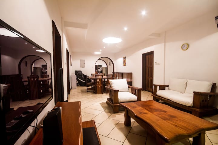 0 | A spacious room with a high ceiling and white walls, featuring a large wooden dining table with matching chairs, a white sofa with cushions, and a wooden bench. The room has a tiled floor and is well-lit by natural light coming from a skylight. There is a clock on the wall and a mirror reflecting the room's interior. | Tágas szoba magas mennyezettel és fehér falakkal, nagy fa étkezőasztallal, hozzáillő székekkel, fehér kanapéval, párnákkal és fapaddal. A szoba csempézett padlóval rendelkezik, és a tetőablakból származó természetes fény jól megvilágítja. A falon óra és a szoba belsejét tükröző tükör. | |