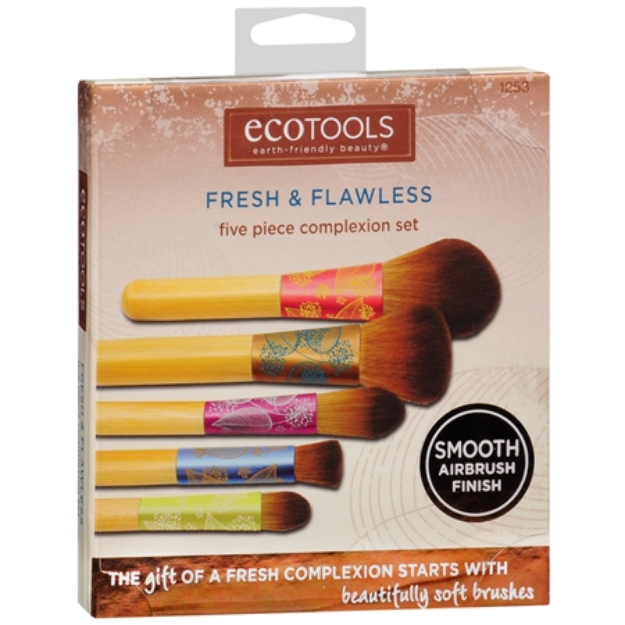 0 | A set of five makeup brushes with wooden handles and bristles in various colors, packaged in a cardboard box with a label that reads 'ECOtools Fresh & Flawless Five-Piece Complexion Set'. The label also includes a tagline 'The gift of a fresh complexion starts with beautifully soft brushes' and a logo. | Öt sminkecset készlet fa nyéllel és sörtékkel, különböző színekben, kartondobozba csomagolva, amelyen az „ECOtools Fresh & Flawless Five-piece Complexion Set” felirat olvasható. A címkén egy felirat is található: „A friss arcbőr ajándéka gyönyörűen puha ecsettel kezdődik” és egy logó. | |