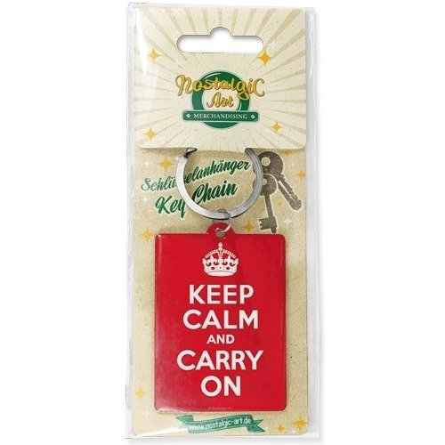 0 | A red keychain with the words 'Keep Calm and Carry On' in white, surrounded by a decorative border, is displayed in a packaging that resembles a vintage postcard. The packaging features a gold border with a decorative design and the words 'Nostalgic Key Chain' at the top. The keychain is attached to a key ring with a g... | A „Keep Calm and Carry On” felirattal fehér, dekoratív szegéllyel körülvett piros kulcstartó vintage képeslapra emlékeztető csomagolásban látható. A csomagolást arany szegély díszíti, és a tetején a „Nostalgic Key Chain” felirat látható. A kulcstartó zöld címkével ellátott kulcstartóhoz van rögzítve, amelyen a „Schlank... | |