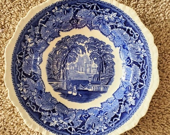 0 | A blue and white porcelain plate with intricate floral patterns and a central circular design featuring a landscape with a river, trees, and a cityscape in the background. The plate is placed on a beige surface. | Kék-fehér porcelántányér bonyolult virágmintákkal, központi kör alakú, folyóval, fákkal és városképpel a háttérben. A lemezt bézs színű felületre helyezzük. | |