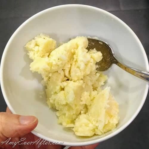 0 | A person's hand is holding a white bowl filled with mashed potatoes. A spoon is partially inserted into the bowl, with some mashed potatoes on it. The bowl is placed on a surface, and the person's fingers are visible, holding the bowl. | Egy személy keze egy fehér tálat tart burgonyapürével. A tálba részben belehelyezünk egy kanalat, rajta burgonyapürével. A tálat egy felületre helyezzük, és a személy ujjai láthatóak, a tálat fogja. | |