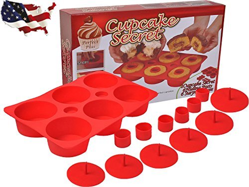 0 | A red cupcake mold with a box of 'Cupcake Secret' on top is displayed. The box features a hand holding a cupcake with a bite taken out of it, and the words 'Cupcake Secret' are written in bold letters. The mold has six cavities, and there are nine red cupcake liners scattered around the base of the mold. | Megjelenik egy piros cupcake forma, tetején egy doboz „Cupcake Secret” felirattal. A dobozon egy cupcake-t tartó kéz látható, amelyből egy falat van, és a „Cupcake Secret” felirat félkövér betűkkel van írva. A forma hat üreggel rendelkezik, és kilenc piros cupcake-béléssel van elszórva a forma alján. | |