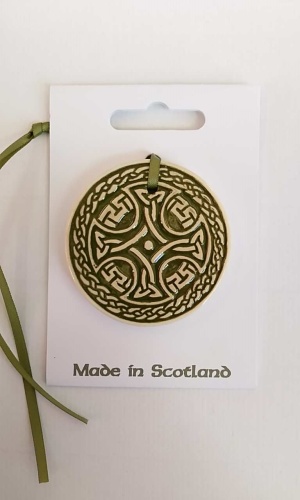 0 | A green Celtic knot pendant with a textured surface is displayed on a white background. The pendant is attached to a green cord and is packaged in a clear plastic bag with a white label that reads 'MADE IN SCOTLAND'. The pendant is positioned slightly to the left of the center of the image, and the cord is draped over ... | Fehér alapon egy texturált felületű zöld kelta csomós medál látható. A medál zöld zsinórhoz van rögzítve, és átlátszó műanyag zacskóba van csomagolva, fehér címkével, amelyen a „MADE IN SCOTLAND” felirat olvasható. A medál a kép közepétől kissé balra helyezkedik el, a zsinór pedig a táska bal alsó sarkára van terítve. | |