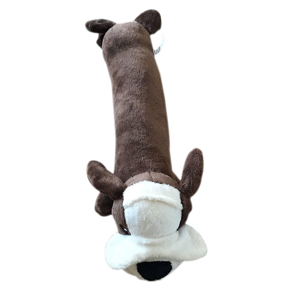 Fehér alapon fejjel lefelé lóg egy fehér szájú és mancsos barna kutya plüssjátéka.