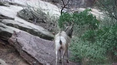 A deer is standing on a rocky terrain with sparse vegetation. The deer is facing slightly to the left, and its body is positioned diagonally across the image. The rocks are large and scattered, with some appearing to be part of a cliff. The vegetation is limited to a few small shrubs and some grass, with a tree visible in the background.
