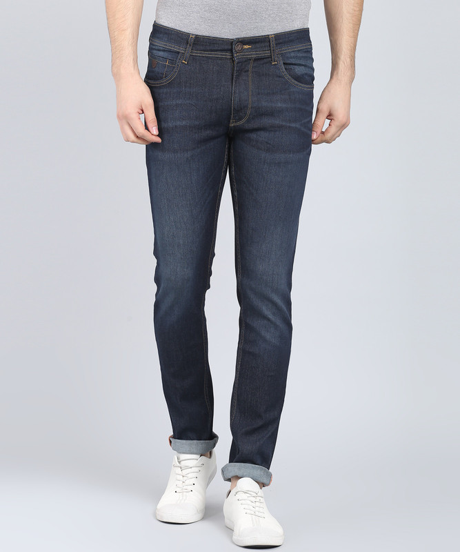 Egy férfi áll az oldala mellett, szürke pólót, kék farmert és fehér tornacipőt visel.