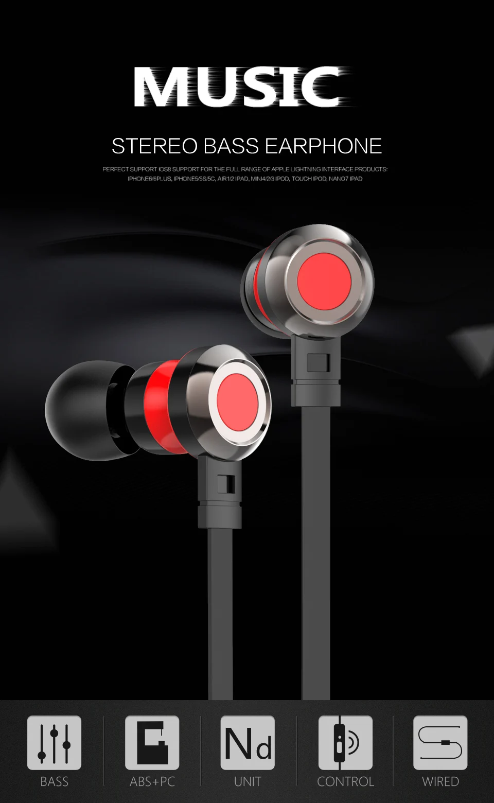 The second image is a close-up of a pair of earphones with a focus on the earbuds and the cable. The earphones are black with red accents on the earbuds and the control buttons. The background is a dark gradient with the word 'Music' in white, stylized font. Below the earphones, there are icons representing various functions such as play, pause, volume control, and a battery icon, along with text labels for each function. The overall design is modern and minimalist, emphasizing the earphones and their features.
