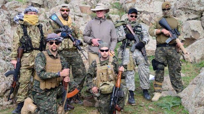 A group of soldiers in camouflage uniforms and gear are posing for a photo. They are standing on a rocky terrain with some vegetation around. The soldiers are armed with various weapons, including rifles and handguns. Some are wearing hats, and one soldier in the foreground is wearing a bandana over his face. The soldiers are positioned in a way that suggests they are part of a military unit, with some standing closer to the front and others in the background.