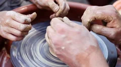 The first image shows a close-up of a person's hands shaping a clay pot on a pottery wheel. The hands are covered in clay, and the person is focused on the task. The pot is in the early stages of formation, with a rough, uneven surface. The background is blurred, emphasizing the hands and the pot.