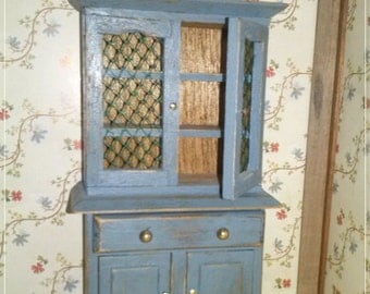 Kék fa szekrény fonott előlappal és virágos tapéta háttérrel.