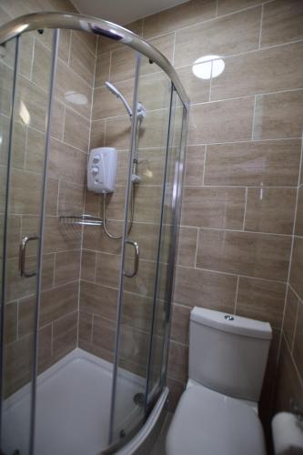 A modern bathroom with a large walk-in shower featuring a glass door and a silver showerhead. The shower is surrounded by beige tiles on the walls and floor. To the right of the shower, there is a white toilet with a silver flush handle. Above the toilet, there is a small white light fixture.