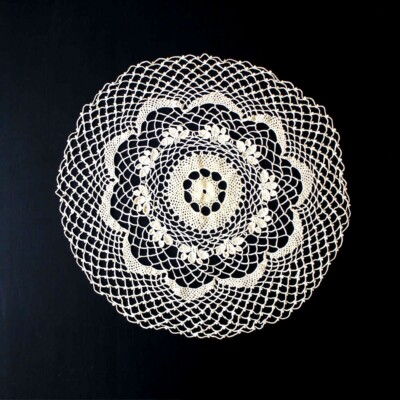 A close-up of a white crochet doily with intricate patterns and a circular center, set against a dark background.