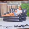 Egy nő fekszik egy fekete bőr kanapén, fehér párnával, fehér pólót és farmer rövidnadrágot visel. Jobb kezében egy távirányítót tart, bal kezét pedig a kanapén támasztja. A szoba zöld fala növényekkel, és több pár fekete cipő van elszórva a padlón.