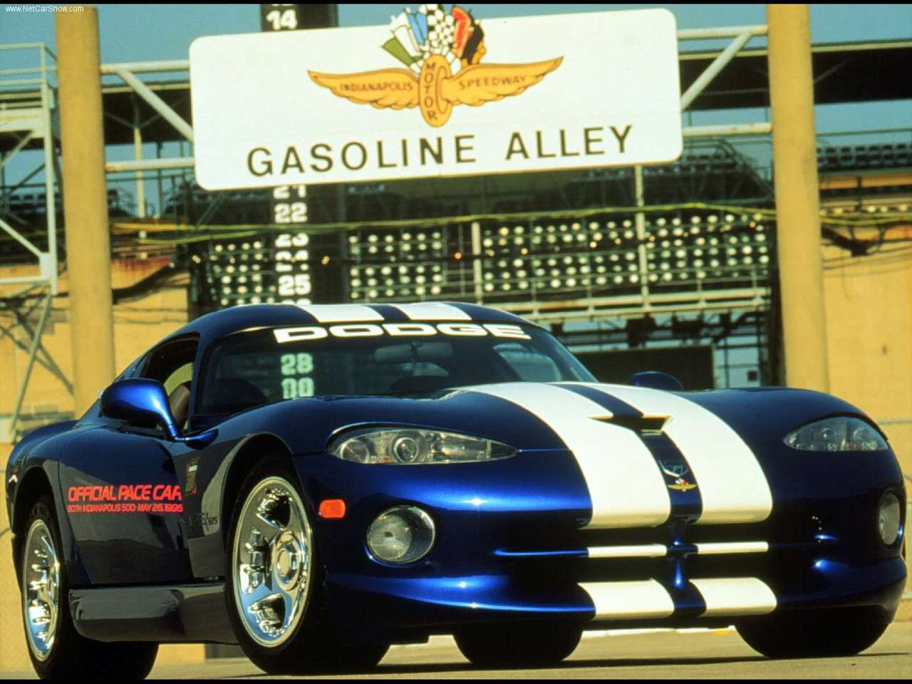 A blue and white Dodge sports car is parked in front of a sign that reads 'GASOLINE ALLEY'. The car has a distinctive design with a white stripe running down the middle and a red logo on the side. The background features a stadium with multiple levels and a clear sky above.
