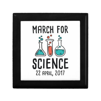 A black square frame with a white background and a white text that reads 'MARCH FOR SCIENCE' in a cursive font. Below the text, there are three illustrations of beakers with blue liquid and red droplets. The date '22 APRIL, 2017' is written in a smaller font below the illustrations.