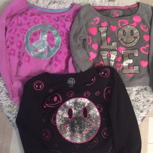 A collection of three children's t-shirts with various designs is laid out on a surface. The first t-shirt is pink with a peace sign and heart patterns, the second is gray with a 'LOVE' design, and the third is black with a smiling face and heart patterns.
