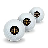Three white golf balls are lined up in a row. Each golf ball has a black and gold logo in the center, featuring a scale of justice with a sword and a set of scales. The logo is surrounded by a circle with a thin black border. The golf balls are placed against a white background.