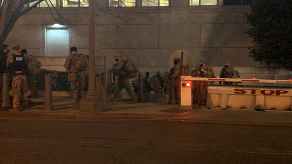 A group of soldiers in camouflage uniforms are standing on a sidewalk next to a stop sign. The stop sign is illuminated with a red light, indicating that it is nighttime. The soldiers are positioned in a line, with some standing closer to the stop sign and others further away. The scene appears to be in an urban setting with buildings in the background.
