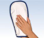 A hand holding a white and blue towel with a blue border.