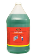 A bottle of green liquid with a red label that reads 'COLDOSCALE' and has a yellow stripe at the bottom. The label also features an image of a thermometer and a blue and white liquid. The bottle is placed against a white background.