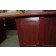 A red wooden cabinet with a closed door and a visible handle is positioned against a white wall. The cabinet is situated in a room with a tiled floor, and there is a wooden countertop visible in the background.