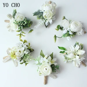 A white mountain goat with curved horns is standing on a rocky mountain slope with patches of grass and yellow flowers. The goat has a thick, shaggy coat and is looking to the side. The background features a clear blue sky and a rocky mountain peak.