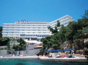A modern hotel building with a blue sign reading 'Hotel' is situated on a hillside overlooking a beach. The hotel has a flat roof and a large glass facade. The beach is populated with people sunbathing and swimming in the clear blue water. There are several umbrellas and sun loungers set up on the sand. The surrounding landscape includes lush green trees and a rocky cliff.