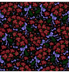 A close-up of a red and purple flower with a detailed pattern of petals and stamens, set against a dark background with a subtle floral pattern.