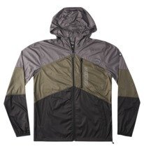 A black and grey jacket with a zipper is displayed against a white background. The jacket has a hood and is made of a shiny material. The zipper is partially unzipped, revealing a black interior lining. The jacket has a modern design with a sleek silhouette and is suitable for outdoor activities.