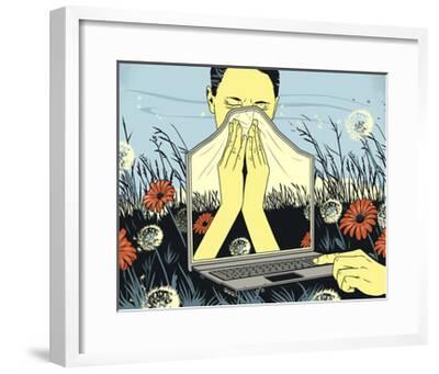 A framed image of a person sitting in a field with a laptop on their lap, holding a tissue to their face as if they are sneezing. The person is wearing a yellow shirt and is surrounded by various flowers and grasses. The image has a stylized, graphic novel-like appearance with a blue and green color palette.