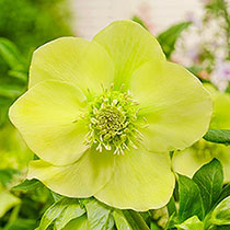 Egy vörös virágos kiegészítővel díszített hosszú rózsaszín hajú személy lila-fekete ruhát visel, a mellen arany emblémával. Egy fehér párkányon ülnek, balra egy cserepes növény, jobbra pedig egy cserepes növény piros virágokkal.