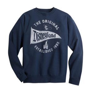 Sötétkék pulóver grafikai dizájnnal, amelyen az ikonikus Disneyland-kastély és a „The Original Disneyland Established 1955” felirat látható az elején. A pulóver bordázott gallérral, mandzsettával és szegéllyel rendelkezik, és egy lefelé tartó ember mintájára készült.