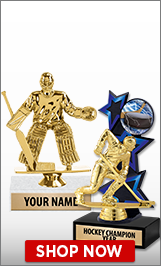 A golden trophy with a hockey player figurine on top, holding a hockey stick, is displayed on a black base with the words 'HOCKEY CHAMPIONSHIP' and 'SHOP NOW' at the bottom. The trophy is placed on a white surface with a hockey stick to the left and a hockey puck to the right.