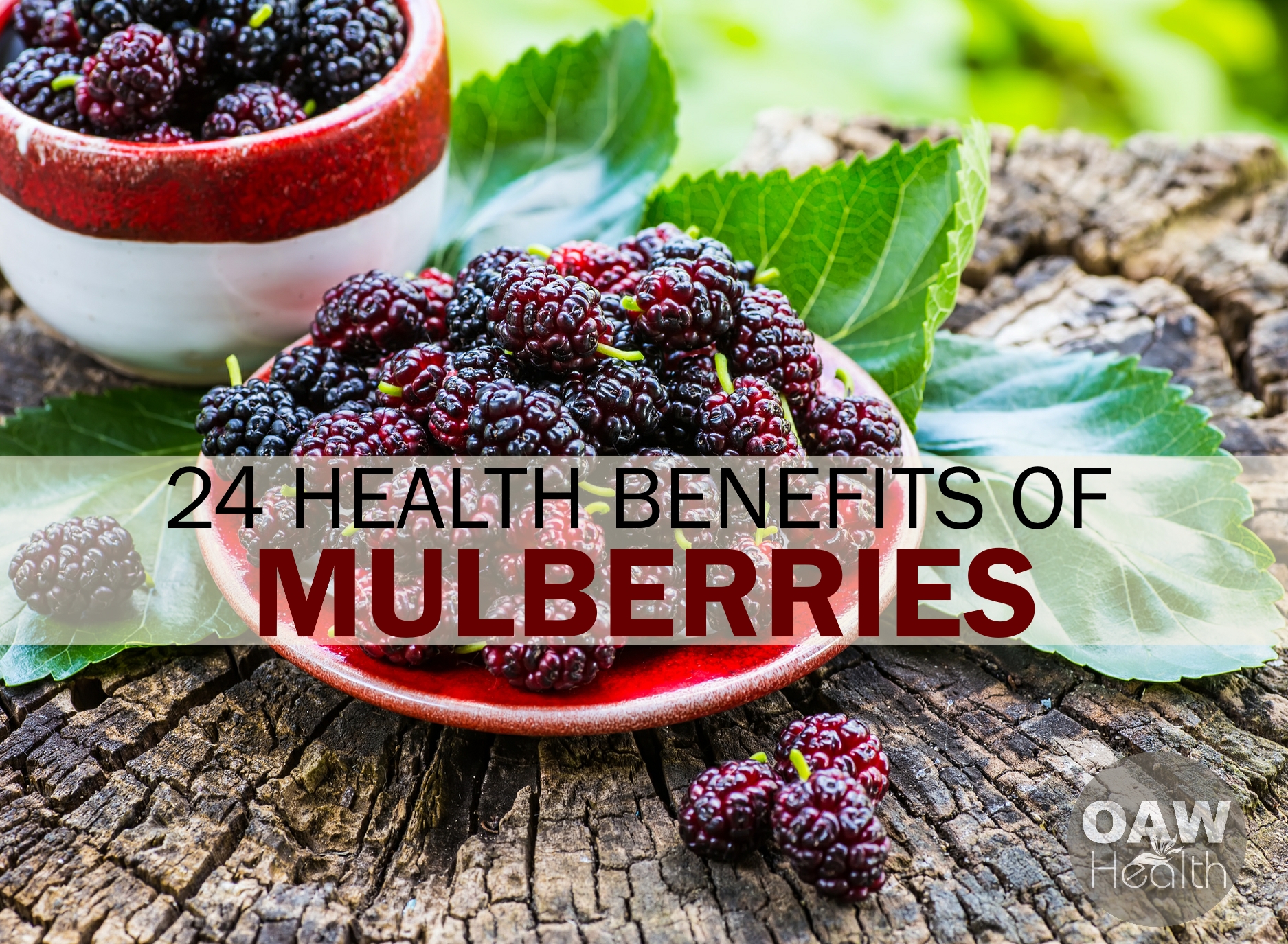 A bowl filled with blackberries is placed on a wooden surface. The bowl is red and has a white rim. The blackberries are ripe and have a glossy appearance. There are green leaves scattered around the bowl, and the text '24 Health Benefits of Mulberries' is overlaid on the image.