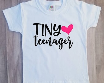 0 | A white t-shirt with the phrase 'Tiny Teenager' written in cursive black lettering, accompanied by a pink heart symbol. The shirt has a round tag with a floral design on the upper left side. | Fehér póló, amelyen a „Tiny Teenager” felirat, fekete betűkkel, rózsaszín szív szimbólum kíséretében. Az ing bal felső részén virágmintás kerek címke található. | |