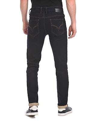 Egy személy áll háttal a kamerának, fekete pólót, övvel ellátott fekete farmert és fekete-fehér tornacipőt visel.