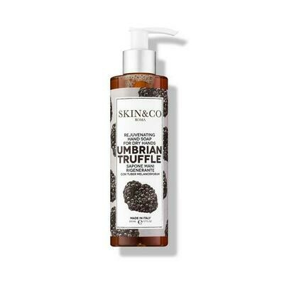 Egy üveg Skin & Co. Umbrian Truffle testápoló fehér pumpás adagolóval és egy fekete-fehér szarvasgomba-mintával és a márkanévvel ellátott címkével. A krém barna kupakkal ellátott átlátszó üvegben van, a címkén fekete háttér található fehér szöveggel és a márka logóval.